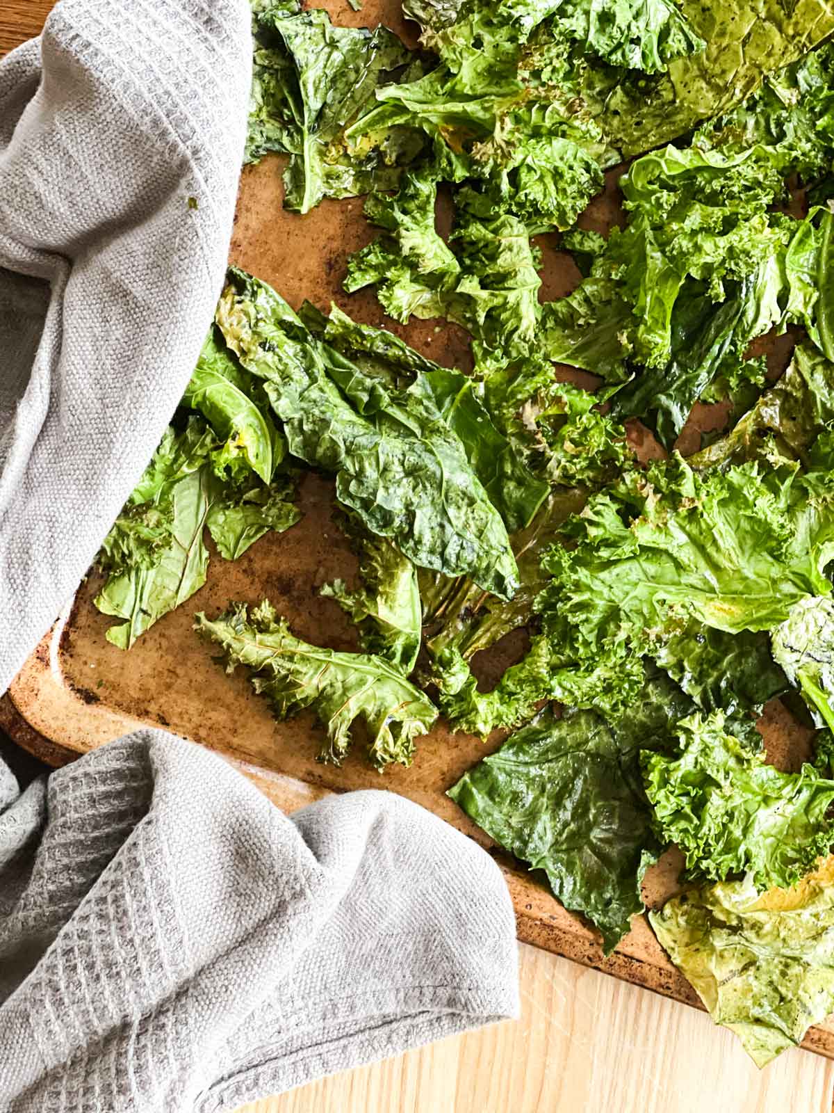 Place seasoned kale pieces onto a large baking sheet. Make sure kale has space and there are no overlaps–this ensures chips are crispy and cook evenly. You may have to use two baking trays.