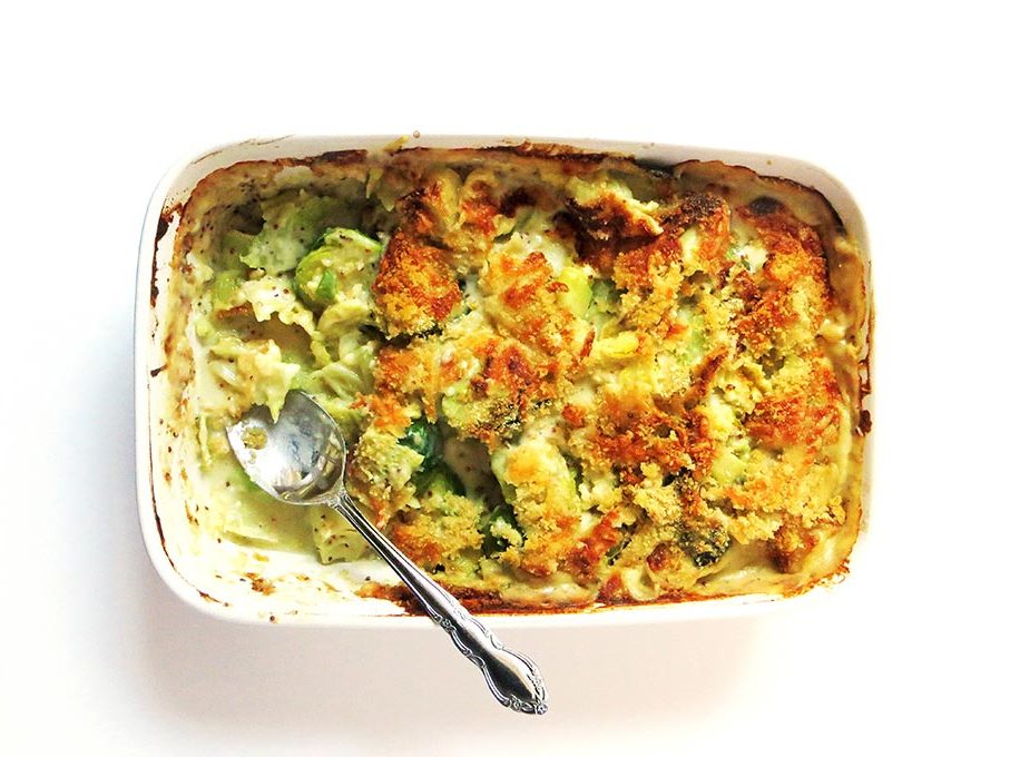 Remove from the heat and give the dish a generous topping of breadcrumbs, panko, or crushed crackers: something to make a crispy topping.